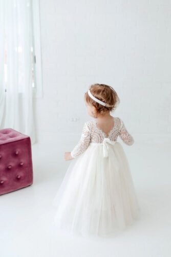 This dress is simply beautiful! It features a delicate white lace bodice paired with a soft ivory tulle skirt for a dreamy, elegant look. The V-back with unfinished lace adds a lovely boho-chic touch, while detailed lace sleeves and a removable flower sash complete this charming special-occasion dress.